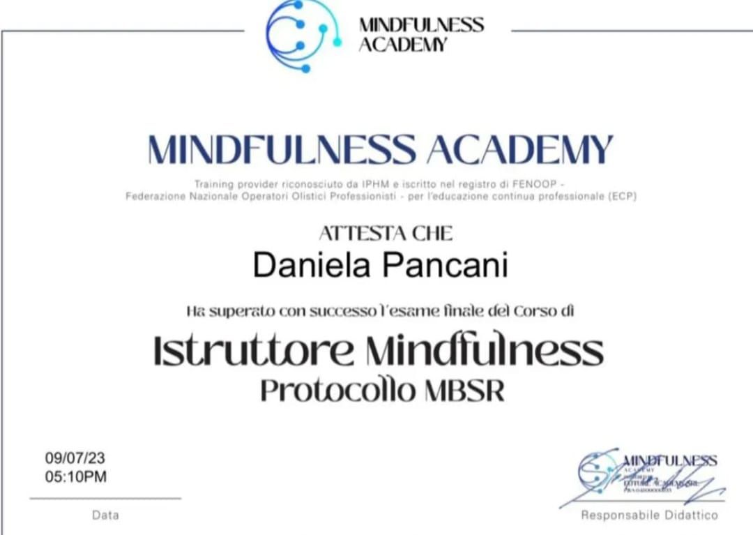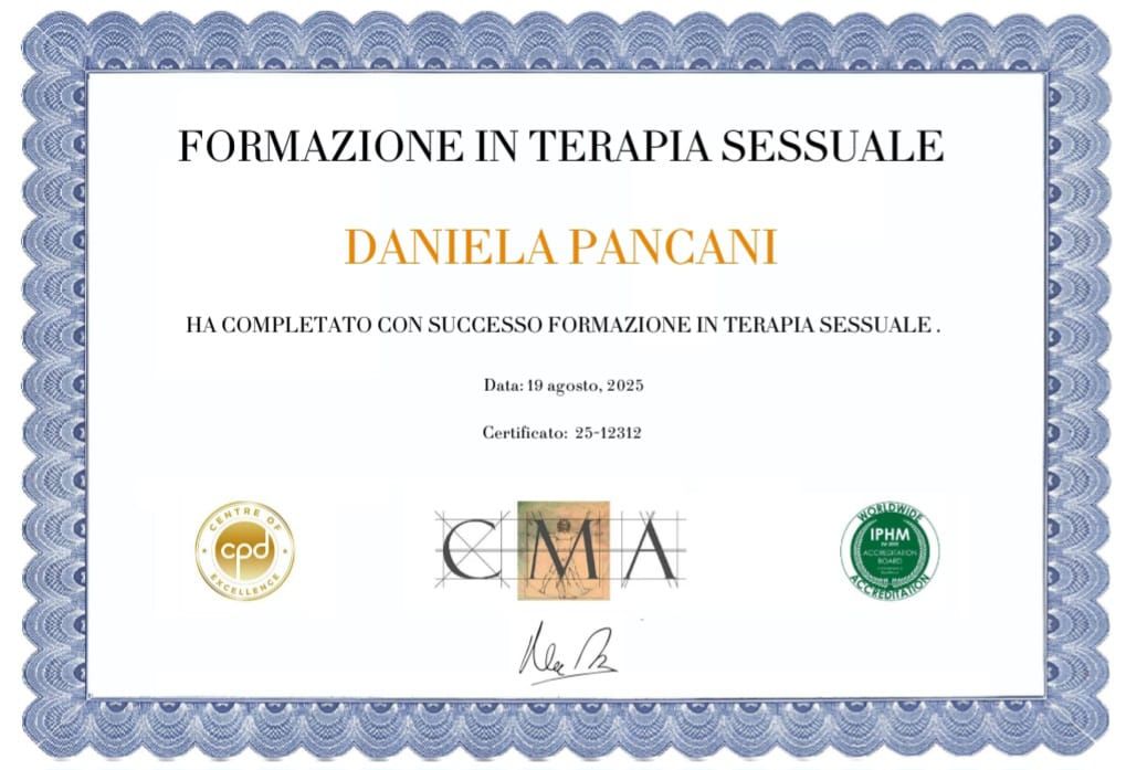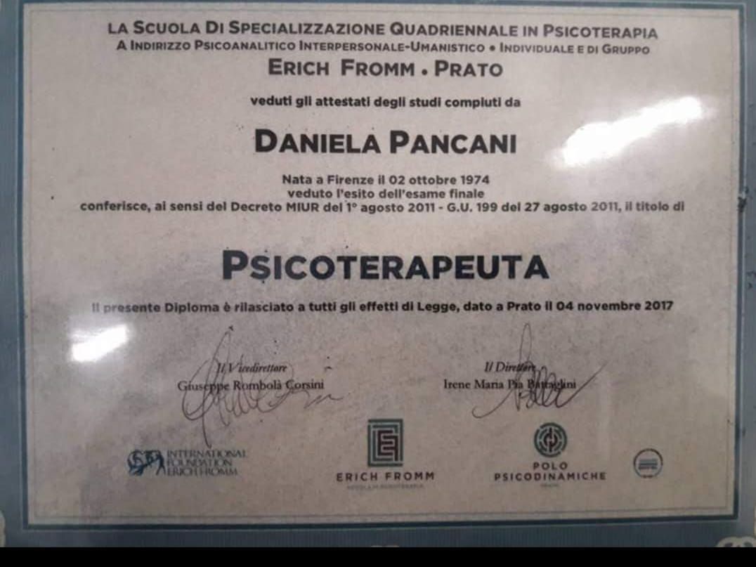 Benvenuti sul mio profilo. Mi presento. Sono la dr.ssa Daniela Pancani. Mi sono Laureata in Psicologia dello Sviluppo e dell'Educazione per poi conseguire la Specializzazione in Psicoterapeuta Individuale e di Gruppo ad Indirizzo Psicoanalitico Interpersonale Umanista Erich Fromm. Conseguo Master Universitari in diversi indirizzi, quali ( Disturbi del Comportamento Alimentare in Età Evolutiva, Mediazione Familiare , Master di II Livello in Psichiatria, Psicopatologia Forense e Criminologia). La mia esperienza nasce nei Centri di Salute Mentale del territorio Fiorentino e nei Servizi Psichiatrici di Diagnosi e Cura dei Servizi Pubblici. Ho svolto la mia formazione prevalentemente nei Centri Antiviolenza, nel Codice Rosa del Pronto Soccorso Ospedale di Careggi e negli Ambulatori dedicati alla Psichiatria Forense del territorio Fiorentino. Ho avuto anche diversi incarichi di Consulente Tecnico e di Perito sia d' Ufficio che di Parte, sia in ambito civile che penale. Nel 2022 sono stata anche Dirigente Psicologo del Serd e della Salute Mentale Adulti per l' ASL Sud Est. La mia esperienza riguarda prevalentemente la "presa in carico psicologica e psicoterapica" di individui, gruppi e famiglie, sia con modalità gruppali che in sessioni individuali, sia in presenza che online. Ho collaborato attivamente anche per Associazioni a tutela delle Vittime di Reati Violenti, impegnandomi oltre che per la presa in carico clinica delle vittime, anche attraverso le associazioni, per cambiare l' ordinamento giuridico vigente, attraverso la diffusione di pdl a tutela della persona. Sviluppo poi interesse per la Medicina Complementare, conseguendo un Diploma di Istruttore di Mindfulness Protocollo MBSR per la riduzione dello Stress, Diploma di Mindfulness Eating, diploma di Auricoloterapeuta secondo la Medicina Tradizionale Cinese, Massaggio Ayurvedico, Operatore Olistico del Benessere, Coach delle Relazioni Affettive e Formazione in Terapia Sessuale. Concepisco gli aspetti legati all' integrazione mente/corpo/anima, come componenti indivivisibili per il raggiungimento della salute e del benessere della persona. Sviluppo anche interessi alle Discipline Sportive, conseguendo un Diploma di Personal Trainer riconosciuto dal CONI, di Istruttore di Kettlebell e di Alimentazione nello Sport. Sto' svolgendo anche un training di apprendimento per la difesa personale attraverso il krav maga e sono Istruttore di Fit- Boxe riconosciutodal CONI, appassionandomi alle discipline di combattimento, sia come filosofia per un corretto stile di vita, che di migliore gestione emozionale ( gestione della rabbia) e delle performance. Attualmente sono professionalmente orientata, oltre che nella pratica clinica convenzionale, anche nell'applicazione delle mie competenze e del mio supporto professionale anche in ambito della Vigilanza, Sicurezza e del personale delle Forze dell' Ordine che ne richiedano supporto, nonché per il sostegno alle loro famiglie. Sono GPG (Guardia Particolare Giurata) e iscritta ad una formazione per Investigatore Privato.